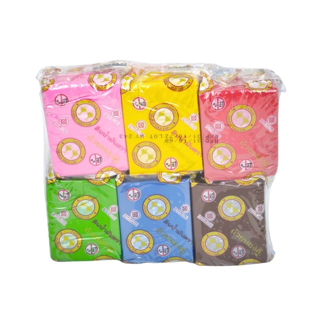 ลักษณะเป็นก้อนสี่เหลี่ยม คละสีในแต่ละห่อ