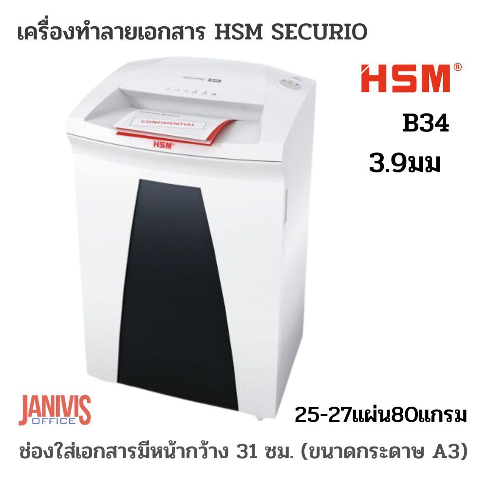 | เครื่องทำลายเอกสารHSM SECURIO รุ่น B-34 (หน้ากว้าง 310 มม. 28-30 แผ่น) คุณสมบัติเครื่องทำลายเอกสาร แบบ 28-30 แผ่น |