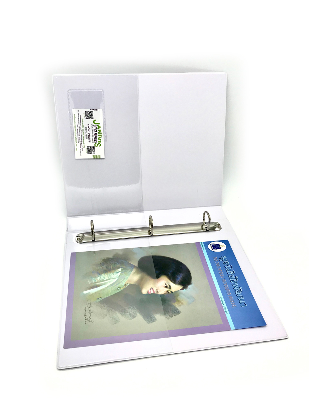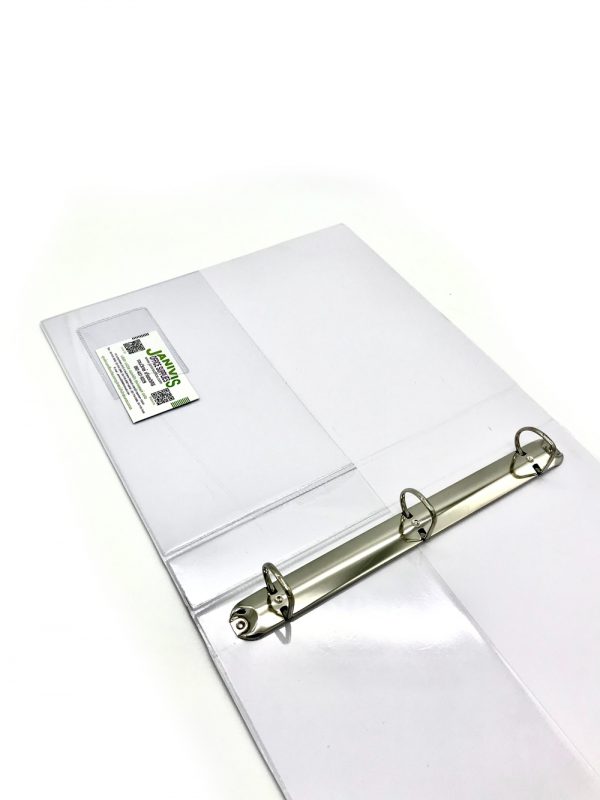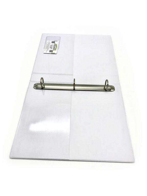 ปกหน้าและปกหลังด้านในมีช่องพลาสติกใสสูง 6 นิ้ว สำหรับสอดเอกสาร